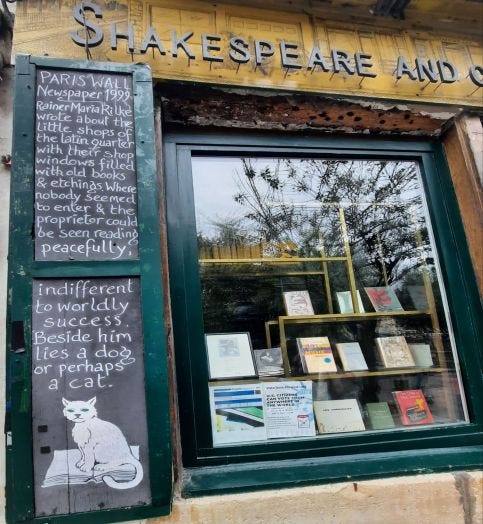 書店剛開門,墨綠色外觀,門牌中間莎士比亞的墨色頭像黯淡著,比不上店門左右兩邊黑板上記著的一個個故事白字的反光,比不上櫥窗裡透出的宛如舊日慶典的橘黃色暖光。後來讀《莎士比亞書店》這本書,讀到書店創始人西爾維婭對莎士比亞頭像招牌的一段記載時才知道,原來書店開業時,招牌就被偷了兩次,第三次把莎士比亞畫得像法國人,才保留下來。