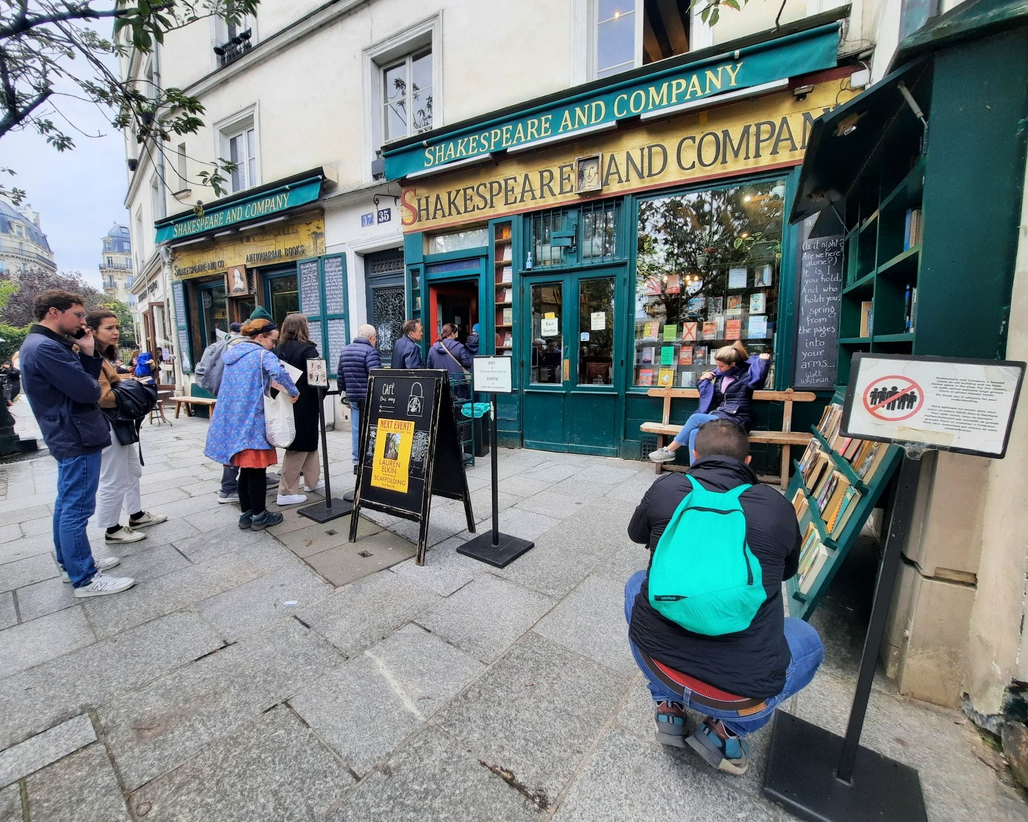 莎士比亞書店和巴黎聖母院就隔著一條塞納河支流,越往書店走,越像進入一個村落,小橋流水,人在橋上拍照。我仍沈浸在和聖母院不期而遇的百感交集裡——真沒想到從書店門口可以直接看到聖母院打著吊瓶的側影。