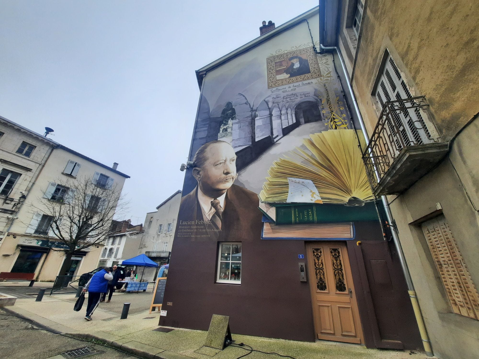 壁畫最高處就是我剛經過的那個廢棄庭院的迴廊,旁邊是一個十三世紀的法國人,啊,他的姓就是聖愛,他是法國神學家和哲學家,生於此地,最後卻被國王和教會逐出法國——聖愛看來是一個姓。後來知道,這個地方得名於一位殉教者的姓,他的遺骸被埋在聖愛教堂。壁畫左下角是法國年鑑學派創始人,著名歷史學家呂西安費夫爾,他死於聖愛,也被埋在聖愛的公墓。而右下角是三本書,書上一個便簽是聖修伯里的手繪——小王子駕著一群鳥在星際間飛行,上面寫著: